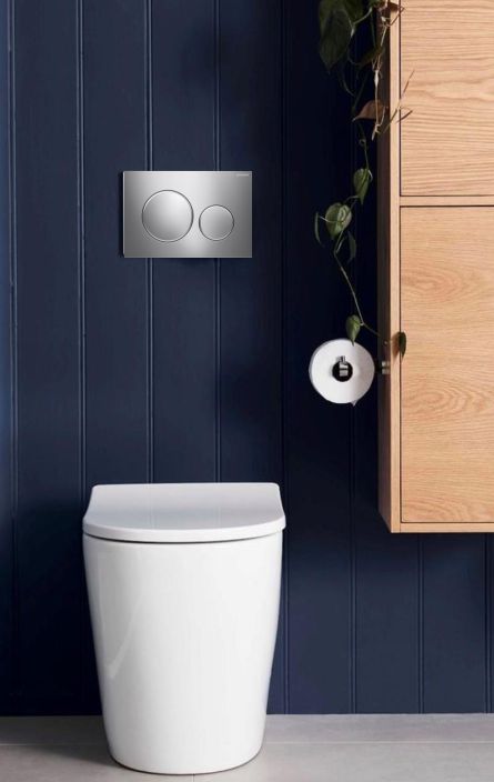 Rimini Rimless Wall Faced Pan with Geberit Inwall Cistern & Sigma Button - Round Chrome Plate - Satin Trim